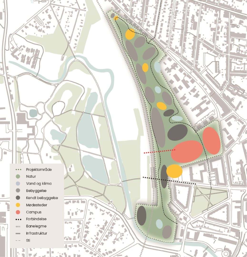 En lang række uddannelser holder til i området – og det skal vi udnytte og få et bæredygtigt samarbejde ud af. Bydelen skal opfordre til nysgerrighed, kreativitet og udvikling, så leg og læring kobles sammen med områdets forskellige faciliteter og bliver en naturlig del af at bruge området.