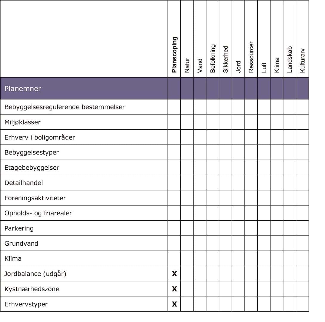 I første kolonne "Planscoping" er det angivet, om forslaget til Kommuneplan 2021-2033 indeholder ændringer af generelle rammebestemmelser. I de efterfølgende kolonner er det markeret, hvorvidt ændringerne vurderes at have indvirkning på de konkrete miljøtemaer. For at fremhæve de vigtige ændringer er den grønne farve udeladt i overbliksskemaet neden for.