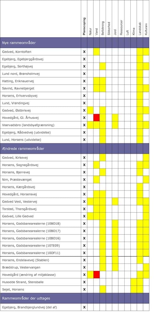 I første kolonne "Planscoping" er det angivet, om forslaget til Kommuneplan 2021-2033 indeholder ændringer af rammeområder ift. nyt udlæg, udvidet/reduceret areal, udtaget område eller ændrede bestemmelser. I de efterfølgende kolonner er det markeret, hvorvidt ændringerne vurderes at have indvirkning på de konkrete miljøtemaer. For at fremhæve de vigtige ændringer er den grønne farve udeladt i overbliksskemaet neden for.