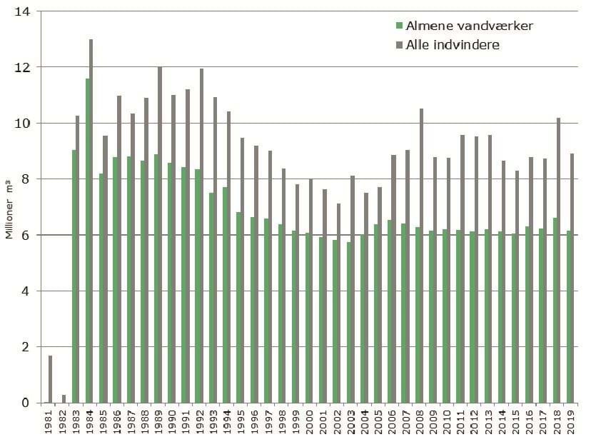 Det fremgår af Figur 1, at den samlede indvinding de sidste 10 år har ligget på omkring 8-10 mio. m3 om året, mens indvindingen på vandværkerne i den samme periode har stabiliseret sig ved ca. 6,2 mio. m3. Der er tidligere indvundet større vandmængder i kommunen, i omegnen af 12 mio. m³ i starten af 90’erne. Helt overordnet vurderes det, at vandværkerne samlet set, fortsat har en tilstrækkelig indvindings- og behandlingskapacitet. På nogle af vandværkerne vil der dog blive behov for at øge vandindvindingen, ligesom der over tid, også kan blive behov for at tilpasse vandværkets indvindingskapacitet ved udbygning med flere indvindingsboringer samt tilpasse vandværkets behandlings og udpumpningskapacitet.