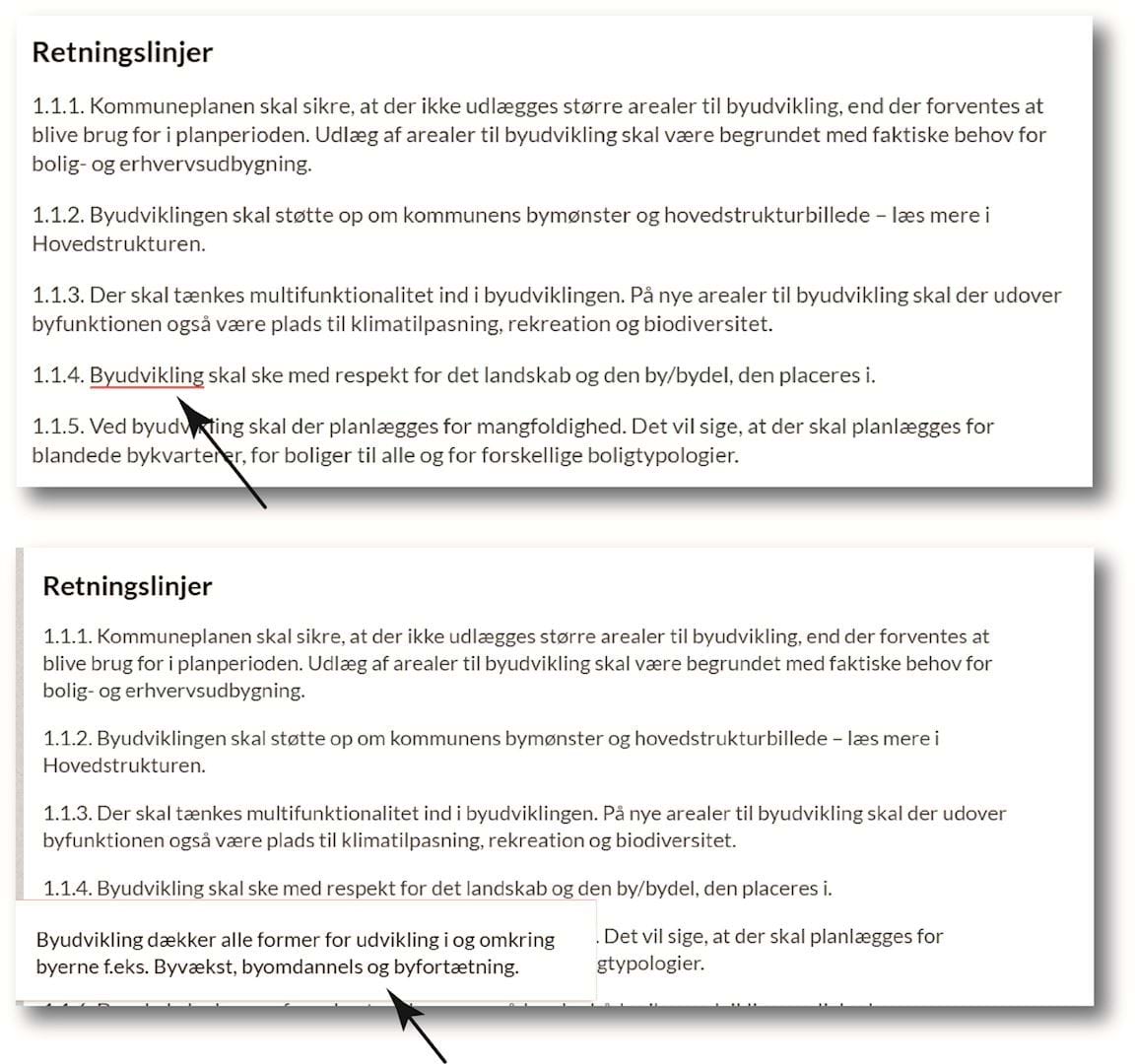 Hvis du holder din kurser hen over disse ord, vil der dukke en lille forklaring på ordet op. På den måde håber vi, at kommuneplanen bliver mere tilgængelig for læseren.