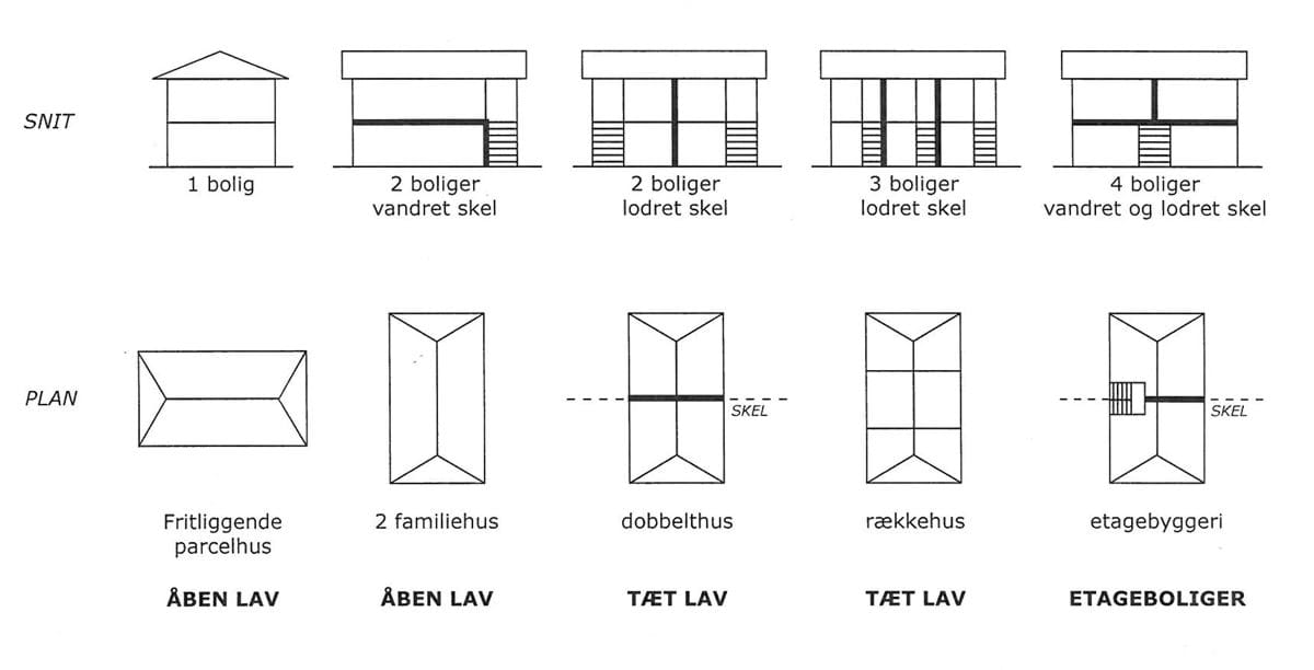 Tæt-lav boligbebyggelse er som udgangspunkt helt eller delvist sammenbyggede énfamiliehuse, herunder dobbelthuse, rækkehuse, kædehuse, gårdhavehuse og lignende tæt/lav bebyggelser adskilt med lodrette lejlighedsskel.