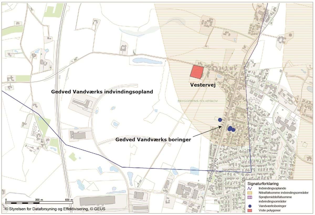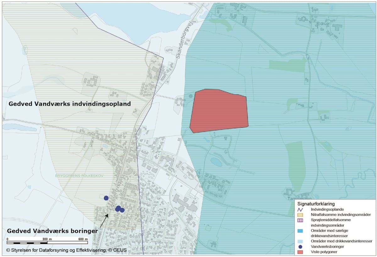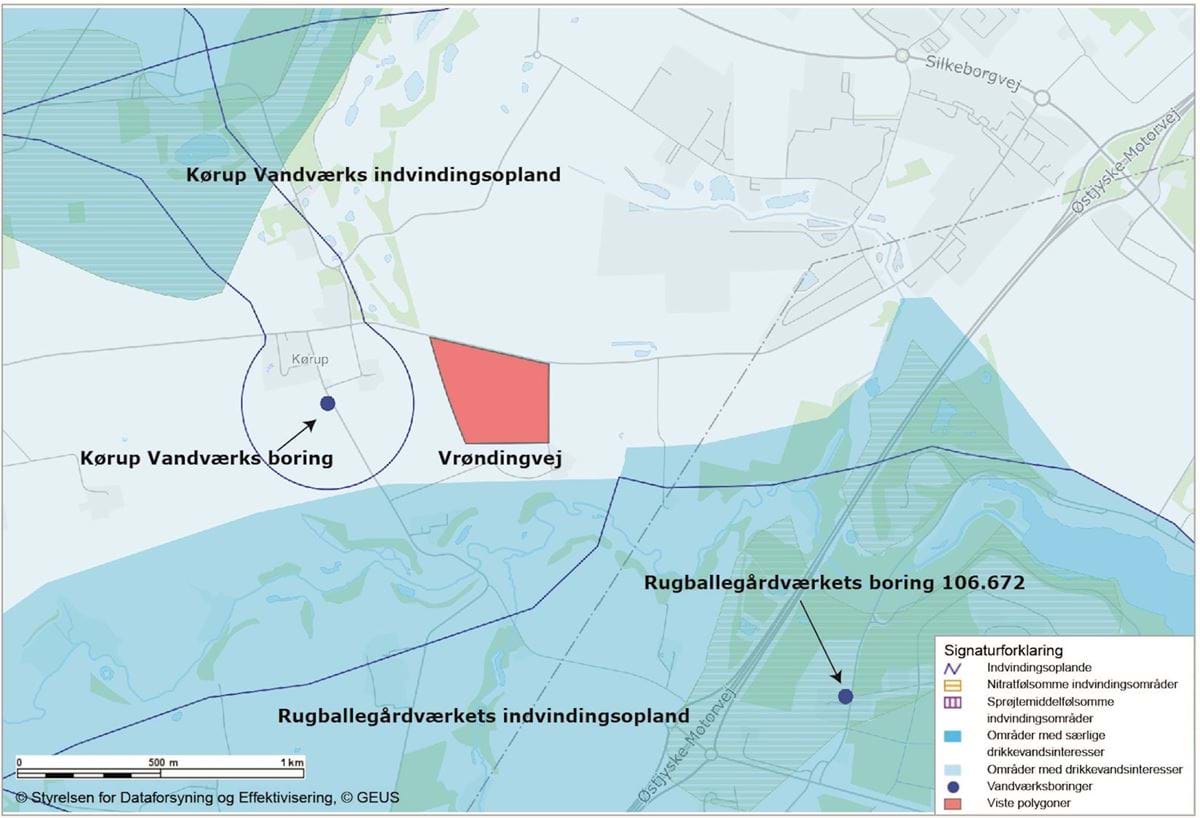 Udlægget ligger desuden over 5 km nordøst for Højballegårdværkets boringer, og vurderes ikke at kunne udgøre en risiko for forurening af Højballegårdværkets boringer.