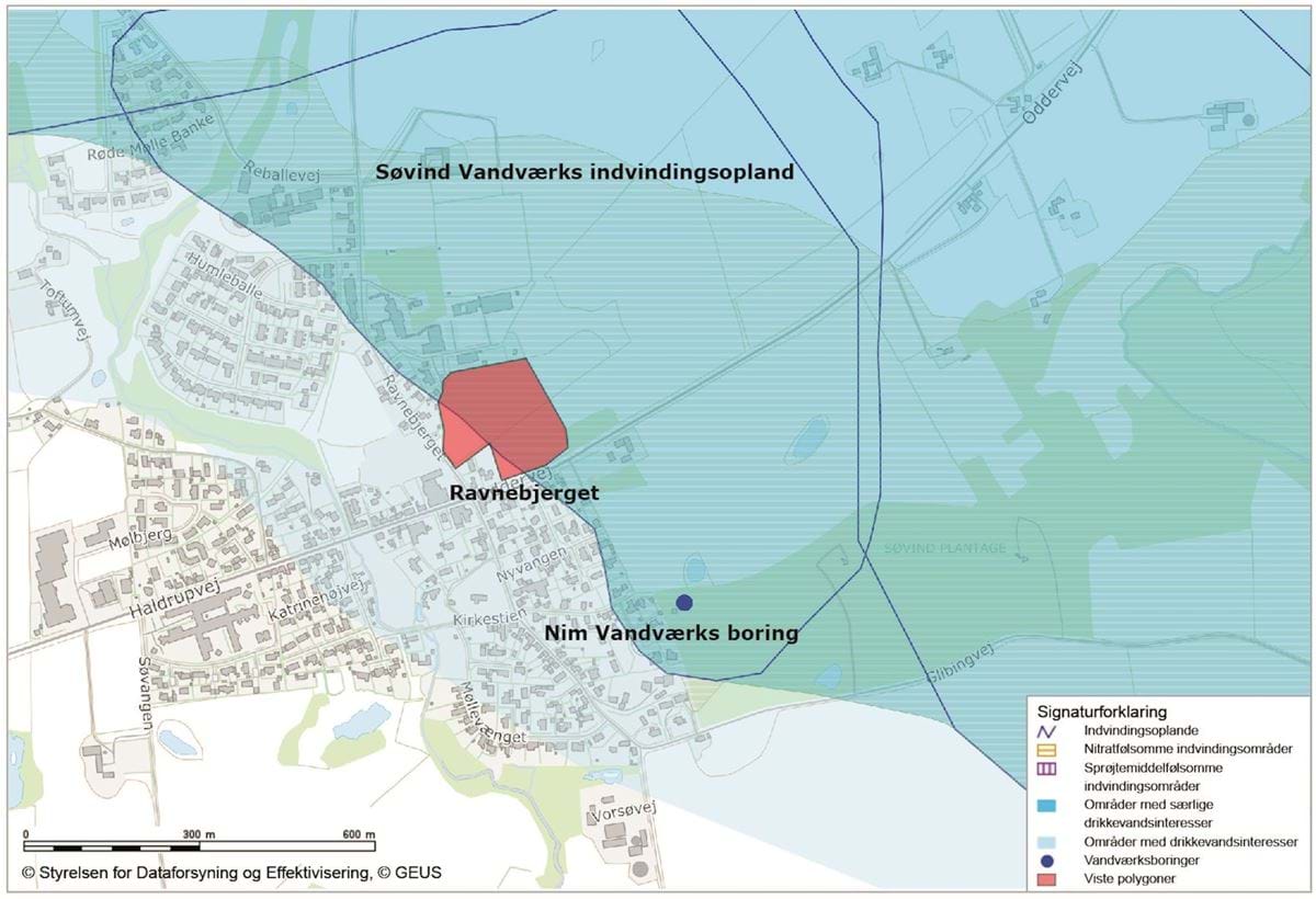 Arealudlægget ligger overvejende indenfor område med særlige drikkevandsinteresser og indenfor Søvind Vandværks indvindingsopland.