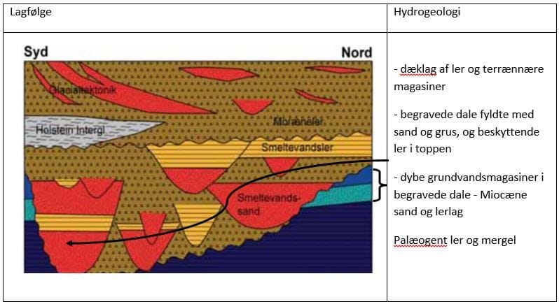Der indvindes fra indfyldninger af smeltevandssand og -grus i begravede dale i flere niveauer – nogle dybere end 100 meter. Der indvindes også fra mere terrænnære sand- og grusmagasiner både i dalene og i plateaubakkerne som linser af sand og grus indlejret i moræneleret. Uden for dalene indvindes der også fra miocænt kvartssand og glimmersand, som man finder umiddelbart under de kvartære sand- og leraflejringer. Det Palæogene ler og mergel udgør den nedre grænse for aflejringer med grundvandsinteresser indenfor kommunen, jf. principskitsen på Figur 2.