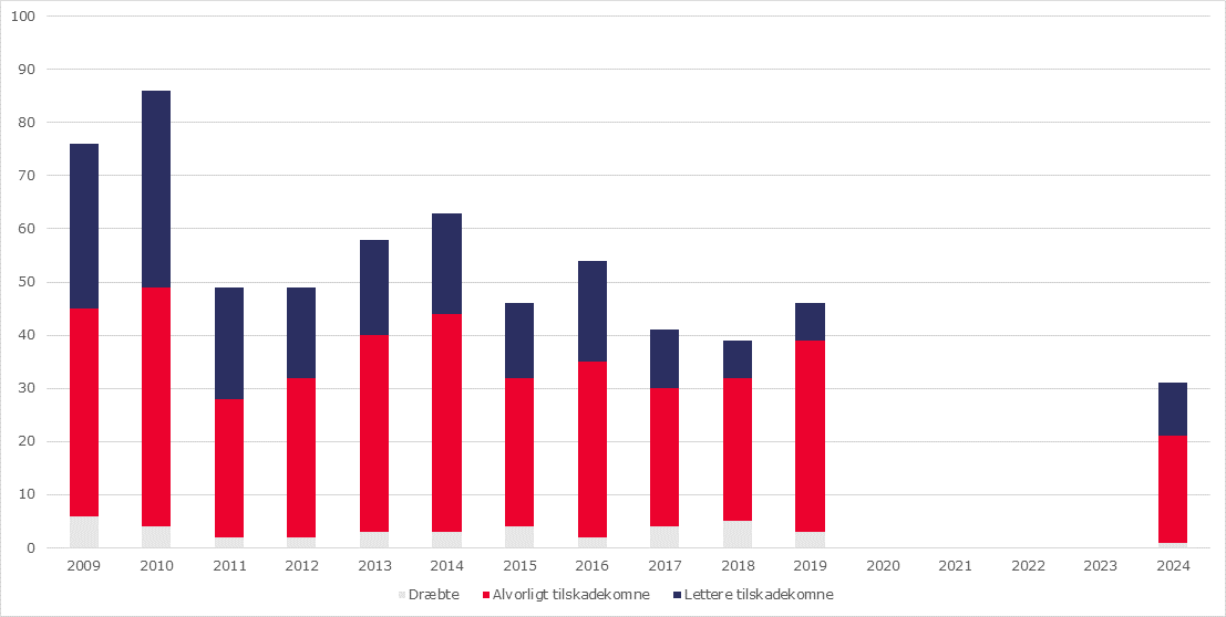 2.6.1. Der skal i 2024 højst være 10 lettere tilskadekomne, 20 alvorligt tilskadekomne og 1 dræbt i trafikken årligt. Dette er med udgangspunkt i de politiregistrerede uheld.
