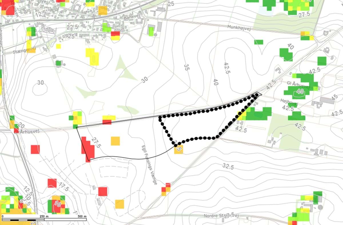 Der er pålagt vejbyggelinjer på Gl. Århusvej. Der bliver reserveret et areal til en landskabelig støjvold uden for vejbyggelinjen.