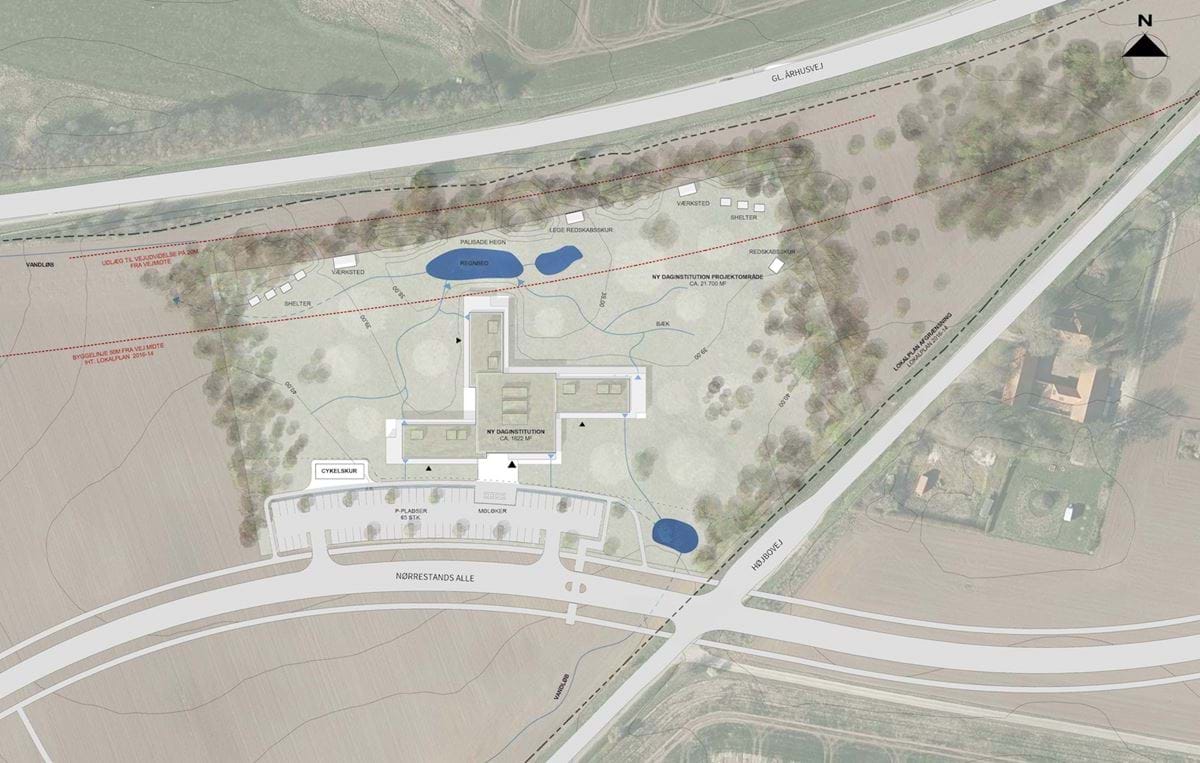 Derudover fastlægger lokalplanen, at daginstitutionen opføres som lavt byggeri i naturmaterialer som træ og begrønnede tage og rykkes tilbage fra Gl. Århus, således at et 50 meter bredt areal fra den gældende lokalplan 2016-14 kan videreføres. Støjreducerende foranstaltninger i form af en kombination af støjvolde og pallisader med bebyggelser sikrer at hverken bebyggelse eller udendørs opholdsarealer er belastet af støj fra trafik. Vejadgang og parkering sker fra Nørrestrands Allé.