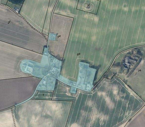 Bebyggelsen markeret med blå viser de tidligste optegnede bebyggelsesstrukturer, som fortsat er synlige i dag.
