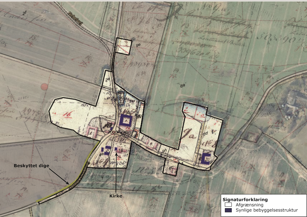 Kapellet, kirkegården, 2 hovedgårde, stendigerne samt flere enkeltstående bebyggelser fra før udskiftningen, er fortsat synlige. De nævnte bebyggelser og anlæg samler byen, så man fortsat fornemmer historien. Byens spredte træbeplantning, blandt andet i form af store solitære træer, understreger samtidigt det snoede gadeforløb og det kuperede landsbylandskab. Flere steder opleves træernes krone som et tag der ”beskytter” og afgrænser byen markant mod det åbne land og slører eller begrænser indkigget til selve byen.