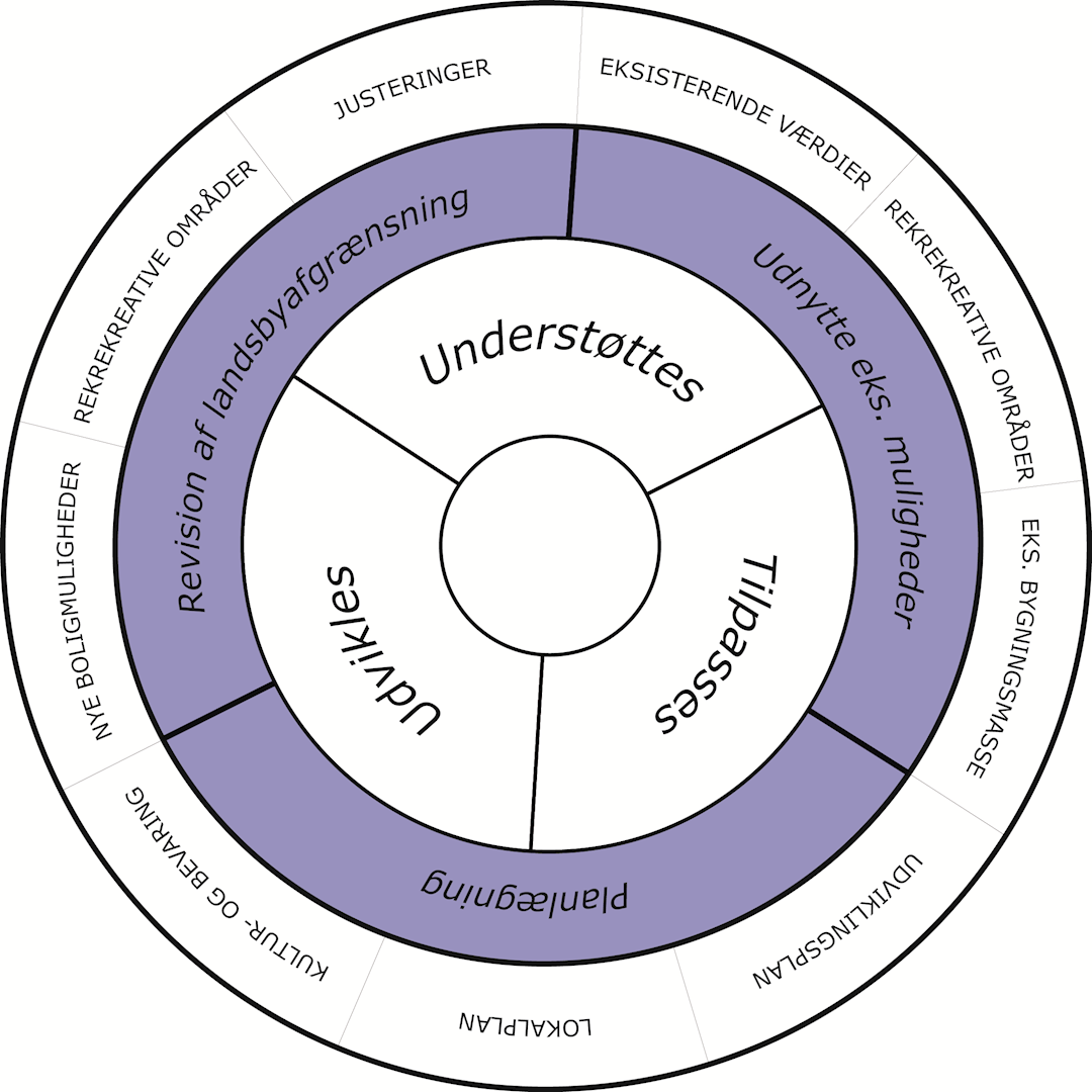 Strategien for de enkelte landsbyer udmønter sig, som konkrete anvisninger, hvor byggemuligheder, rekreative områder og ind- og udsigtskiler er kortlagt for hver landsby.