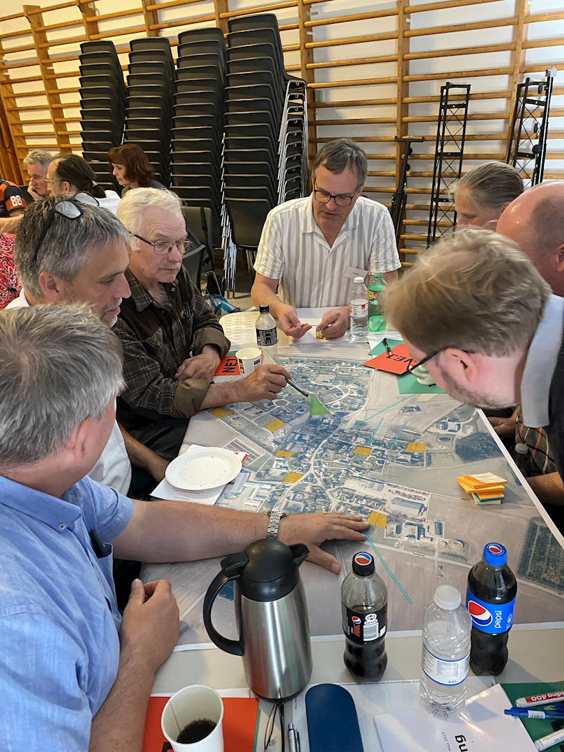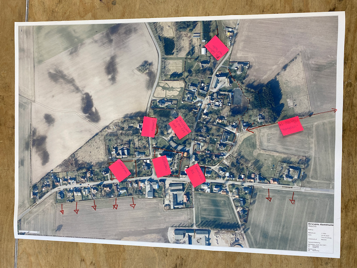 I denne øvelse arbejdede borgerne med et stort kort over landsbyen, hvor de skulle udpege vigtige funktioner og mødesteder, særlige naturoplevelser, kig i landskabet som skal bevares, og andre vigtige særkender, som de gerne vil have, at administrationen er opmærksom på i udviklingsarbejdet.