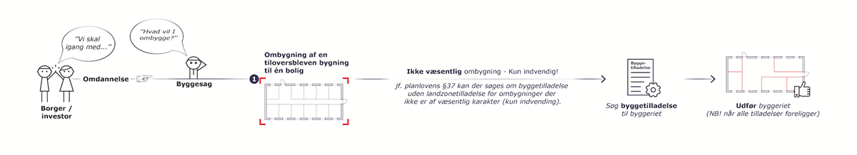 - Skal kunne dokumenteres. at bygningen reelt er overfløddigjort. Ombygningen må ikke på et senere tidspunkt medfører behov for nye bygninger med samme formål