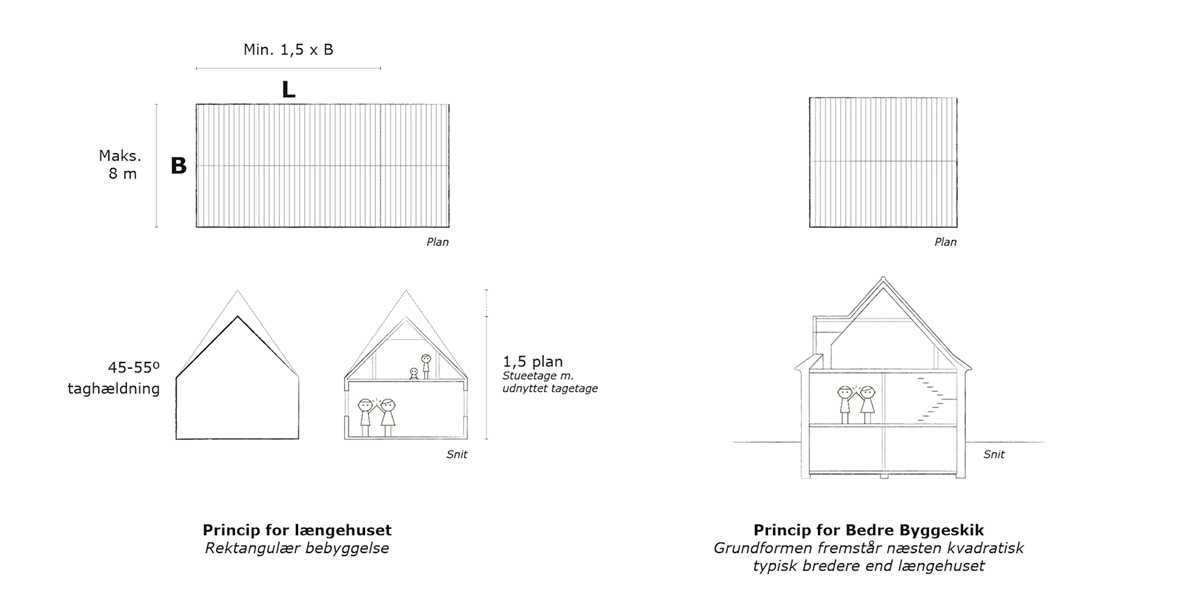 Bygninger skal udføres som længehuse, hvor længden svarer til mindst 1½ gange bredden. Forholdet kan fraviges, hvis byggeriet opføres efter principperne om Bedre byggeskik.