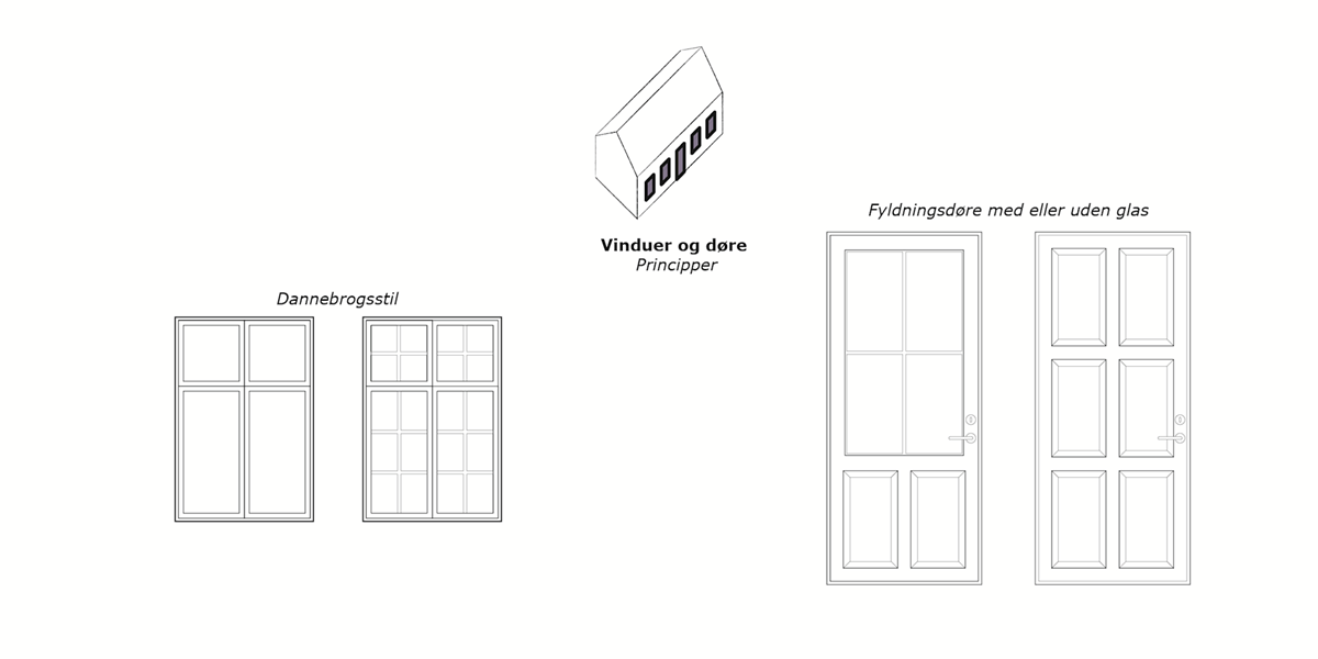 Bygninger skal fremtræde som en blok med dør- og vindueshuller placeret regelmæssigt i facaden. Murhuller til vinduer og døre må højst være 120 cm brede, for dobbeltdøre dog op til 160 cm.