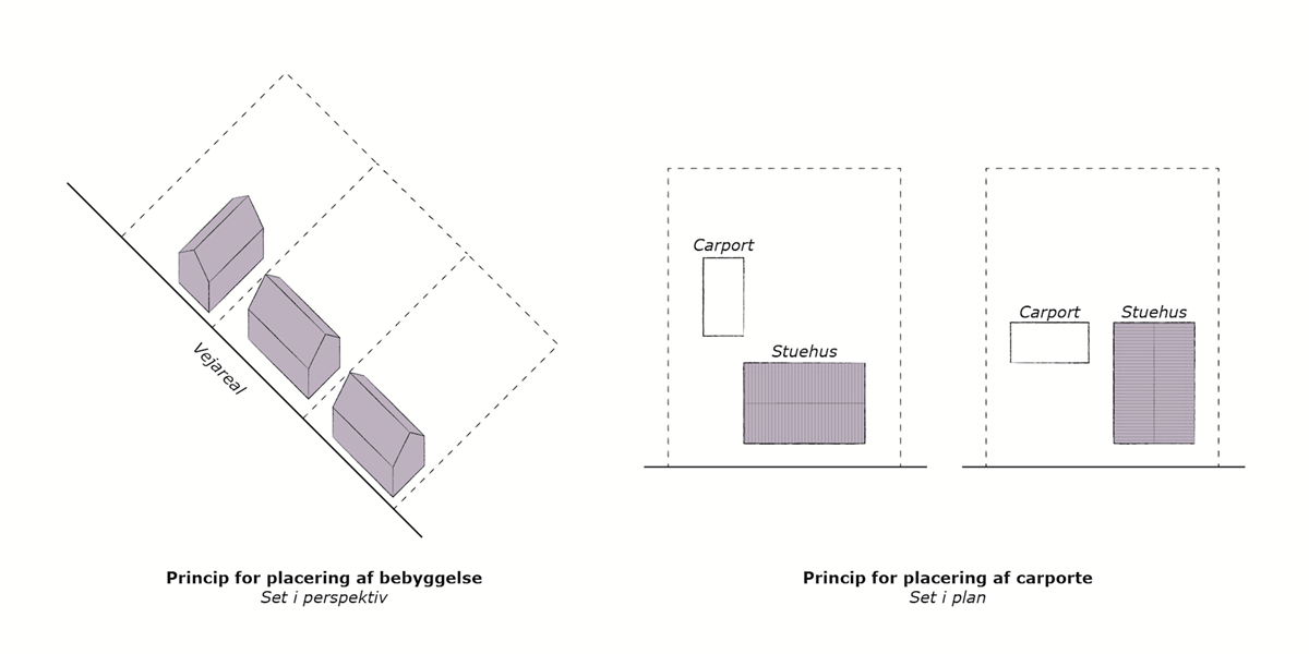Fritliggende bebyggelse, så som carpote, garager og udhuse og lign. skal som udgangspunkt placeres bagved hovedhusets og vinkelret herpå.