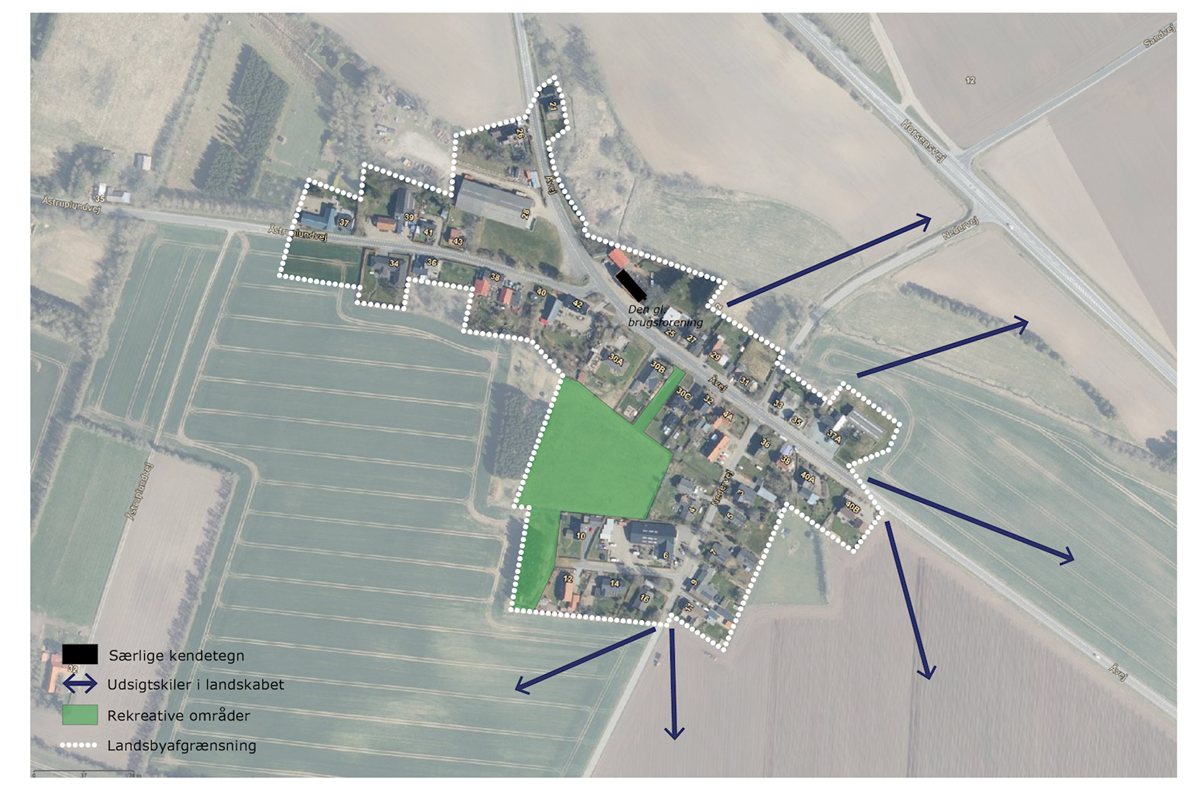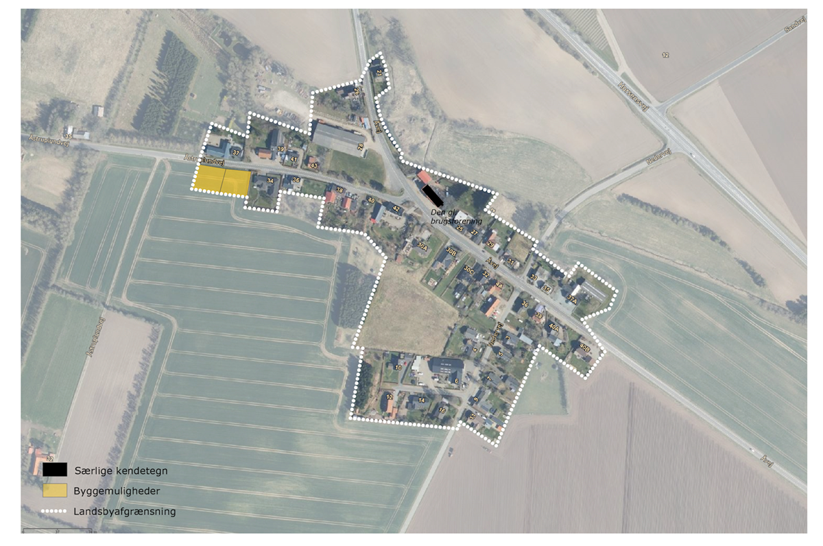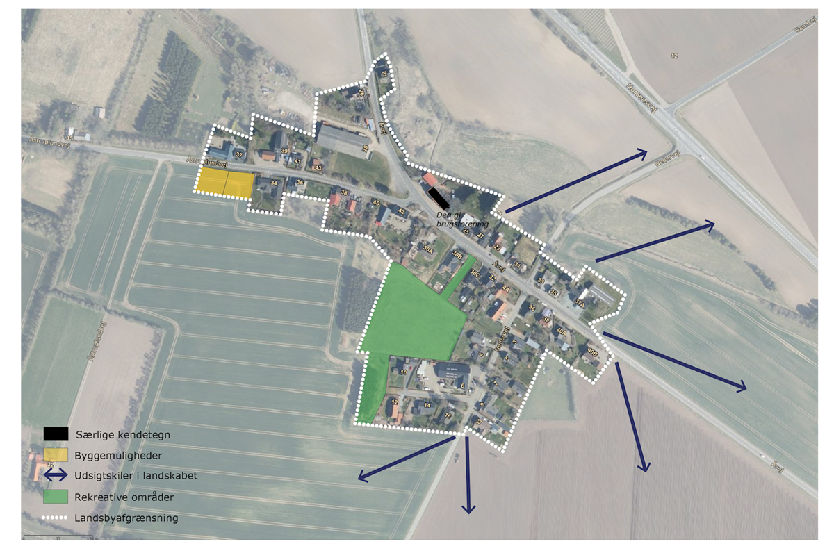 Åstruplund er hertil udfordret af, at der ikke er udlagt tilstrækkeligt med fællesområder, som kan skabe et stærkt lokalsamfund og dermed bidrage til en fremtidig positiv befolkningsudvikling. Der friholdes derfor areal til rekreative formål indenfor landsbyafgrænsningen.