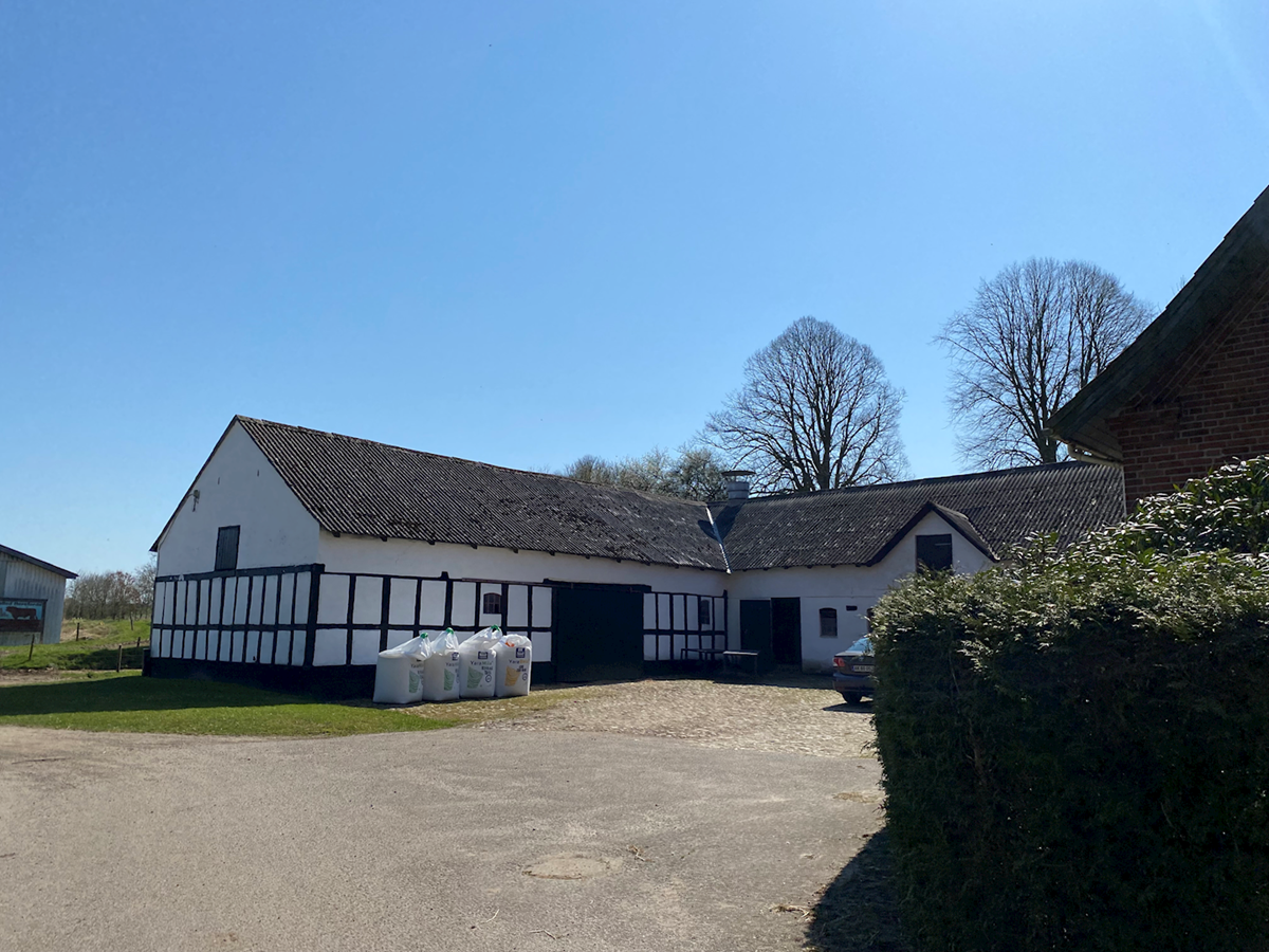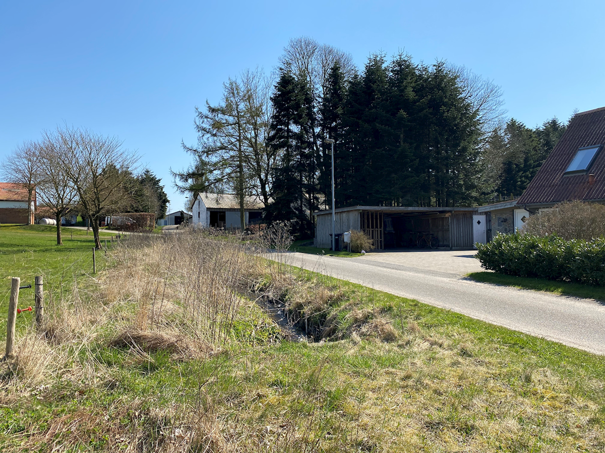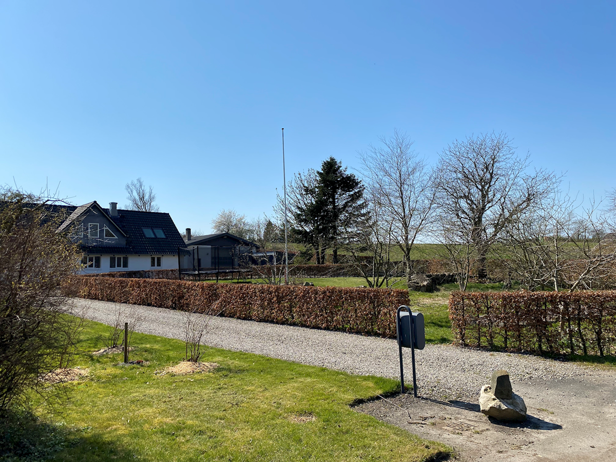 Billedet viser en bolig i Assendrup, med det kuperede landskab i baggrunden.