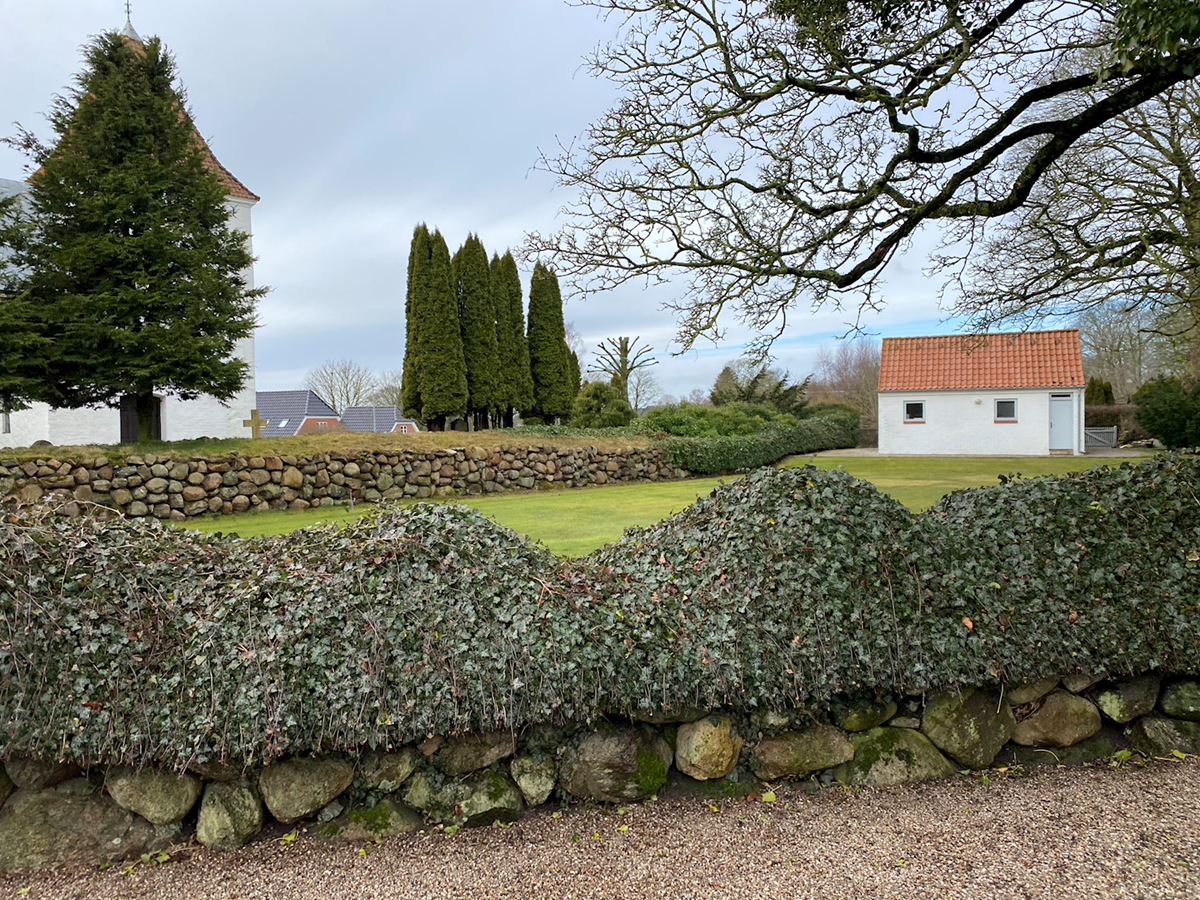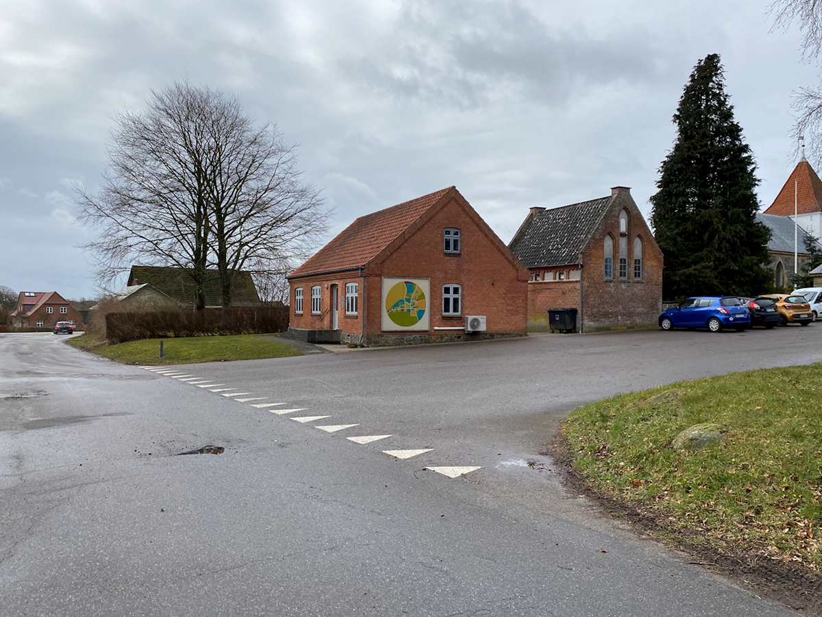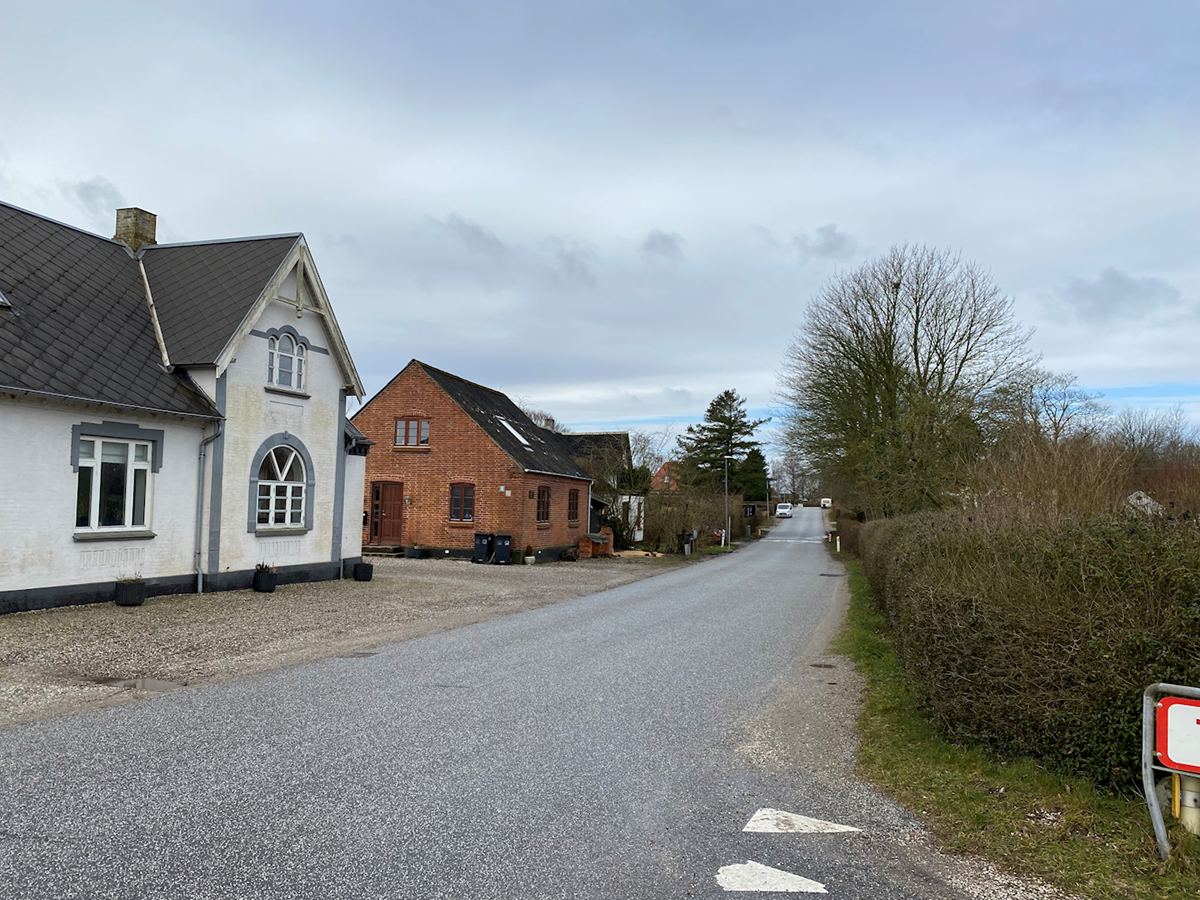 Billedet viser en landsbygade ved Kattrup Kirke.