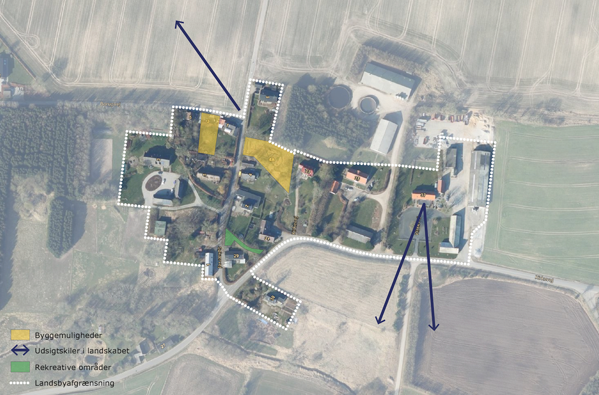 Udpegningerne er foretaget udelukkende for at give borgerne i landsbyen og evt. fremtidige bygherre, et overblik over potentielle fremtidsmuligheder. Det er altså ikke udtryk for, at kommunen kommer til at stå for evt. udvikling, byggerier eller indretning af fællesarealer. Udviklingen skal drives af private investorer, lokalråd, borgere eller fonde. Læs mere her, om hvad der kan søges støtte til i kommunen.