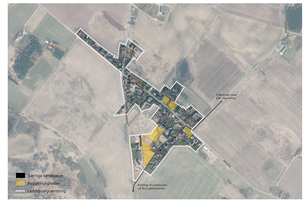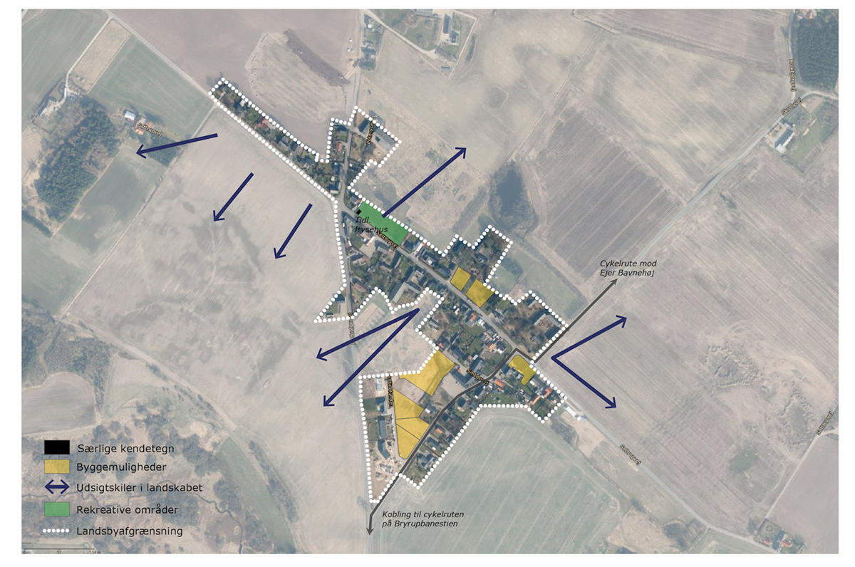 Udpegningerne er foretaget udelukkende for at give borgerne i landsbyen og evt. fremtidige bygherre, et overblik over potentielle fremtidsmuligheder. Det er altså ikke udtryk for, at kommunen kommer til at stå for evt. udvikling, byggerier eller indretning af fællesarealer. Udviklingen skal drives af private investorer, lokalråd, borgere eller fonde. Læs mere her, om hvad der kan søges støtte til i kommunen.