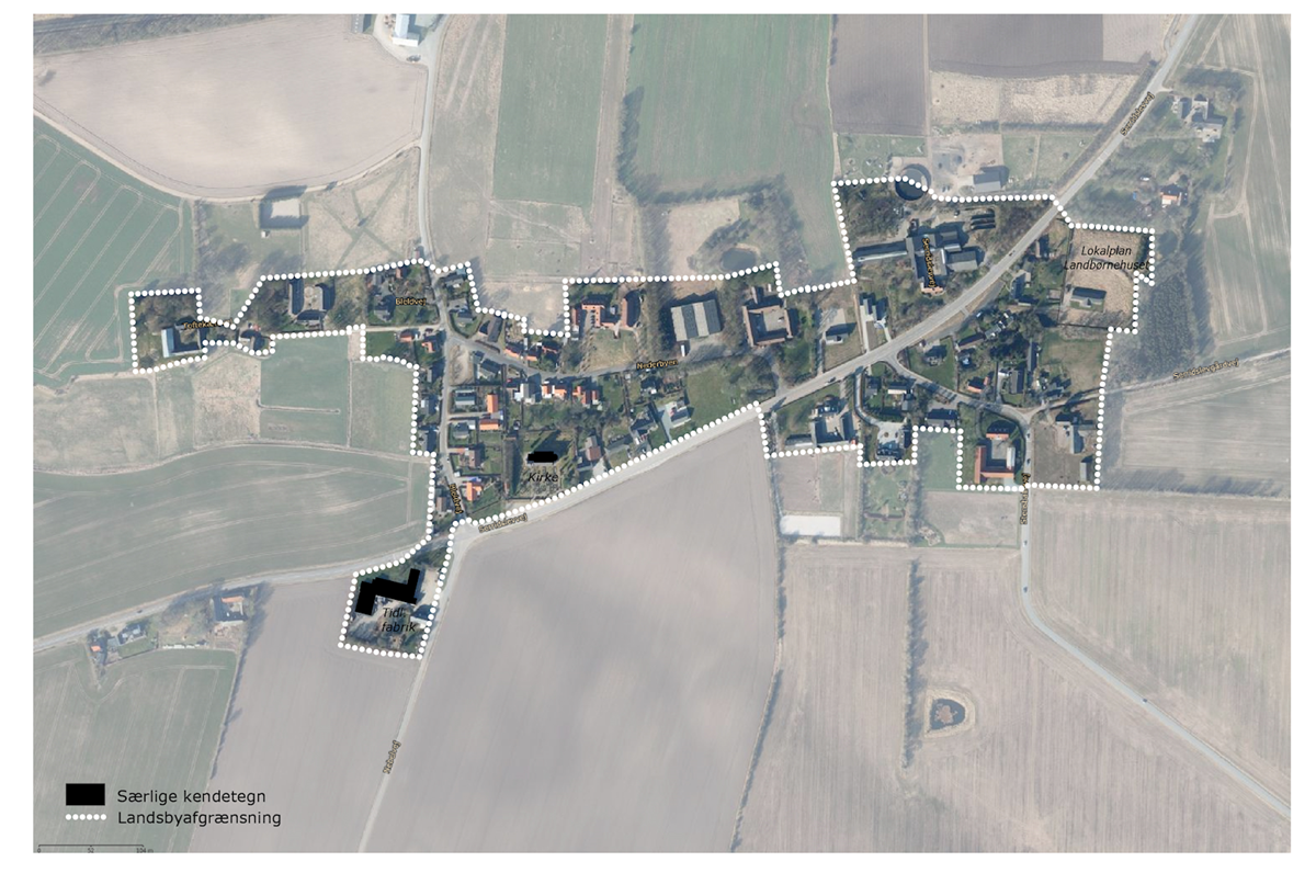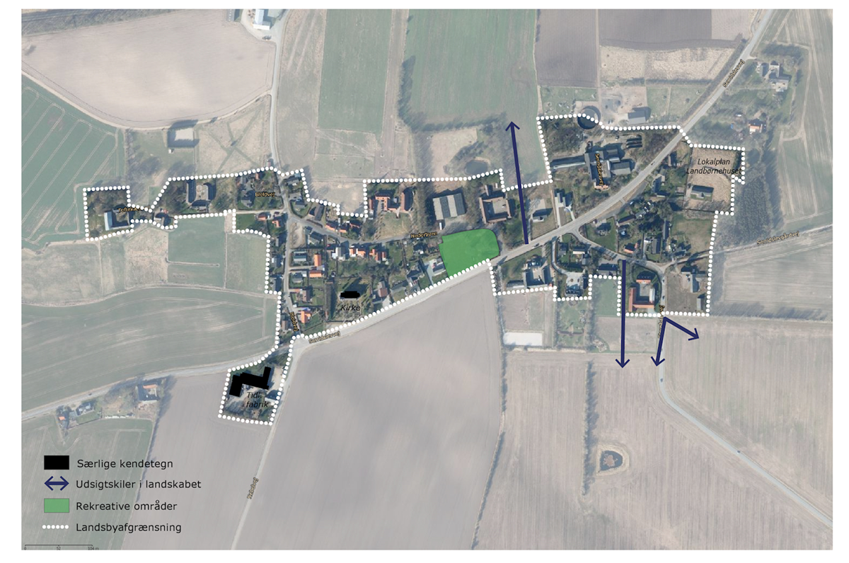 - Et mindre område i den nordvestlige del af landsbyen er udpeget, som lavbundsareal der kan genoprettes.