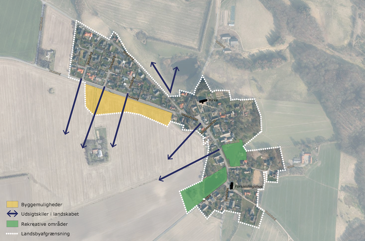 Udpegningerne er foretaget udelukkende for at give borgerne i landsbyen og evt. fremtidige bygherre, et overblik over potentielle fremtidsmuligheder. Det er altså ikke udtryk for, at kommunen kommer til at stå for evt. udvikling, byggerier eller indretning af fællesarealer. Udviklingen skal drives af private investorer, lokalråd, borgere eller fonde. Læs mere her, om hvad der kan søges støtte til i kommunen.