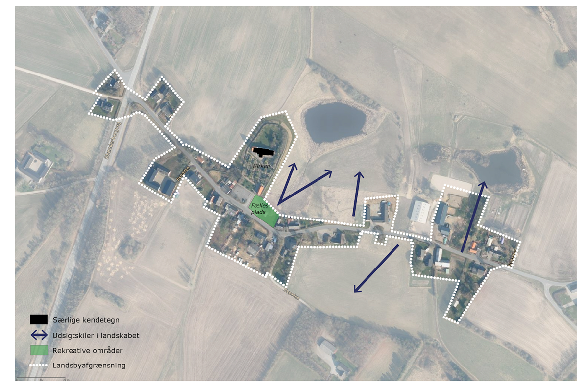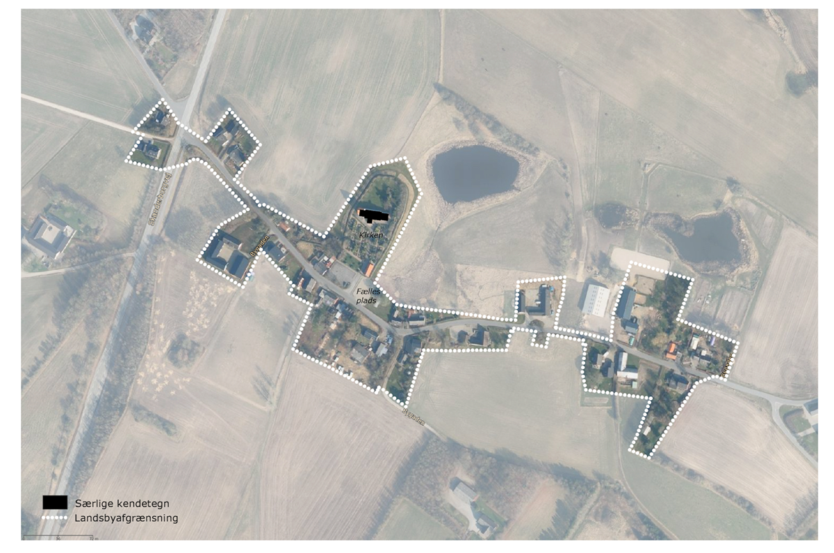 - Store dele af landsbyen ligger i kirkens fjernomgivelser, og centralt også i særligt kirkeområde.