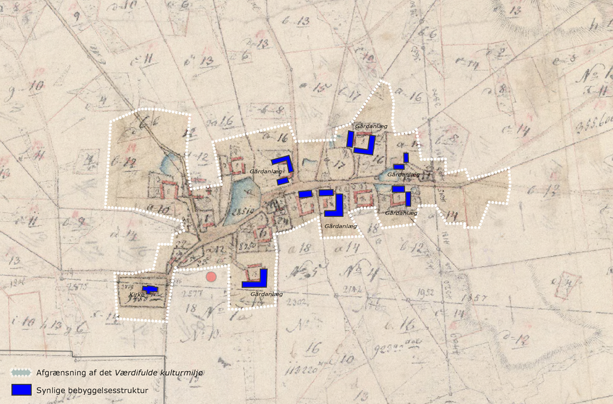 Bebyggelsen markeret med blå viser de tidligste optegnede bebyggelsesstrukturer, som fortsat er synlige i dag.