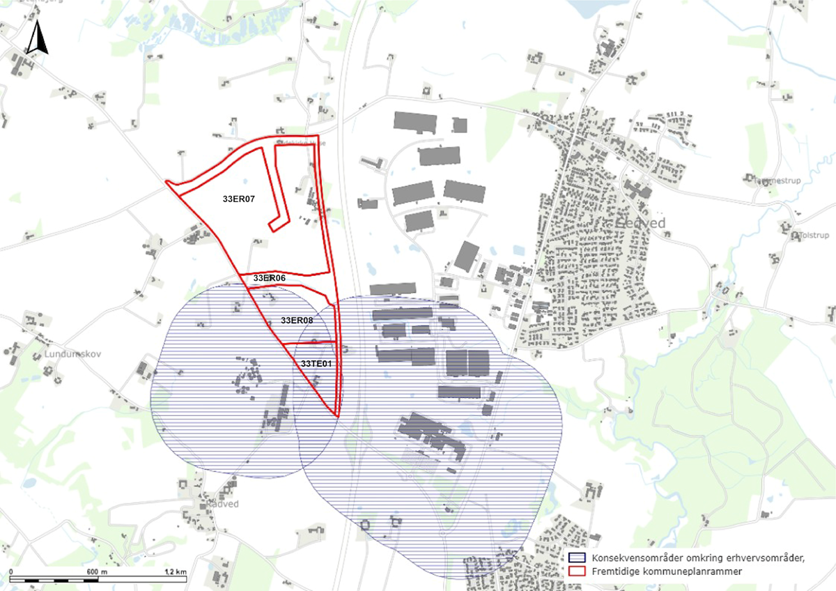 Rammeområde 33ER08 og rammeområde 33TE01 uddyber miljøforholdene: ”Rammeområdet ligger i konsekvensområder for virksomheder med særlige beliggenhedskrav og produktionserhverv. Dette indebærer, at der ikke kan etableres nye boliger eller anden forureningsfølsom anvendelse (kontorer, boliger og lignende) inden for konsekvensområdet. Der kan derudover ikke planlægges for yderligere risikovirksomheder inden for rammeområdet.”