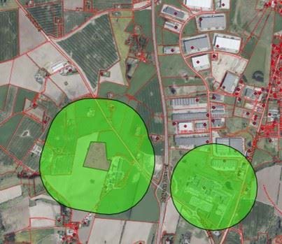 På nedenstående billede er Danish Crowns risikooplag stedfæstet på matriklen med risikokonsekvensområdet, dvs. det område, der risikerer at blive påvirket ved et uheld. Horsens Bioenergis oplag er ikke stedfæstet, ligesom vi ikke kender udbredelsen ved et uheld, og der arbejdes derfor med den planlægningsmæssige konsekvenszone. Vi kender endnu ikke den nøjagtige placering af Horsens Bioenergis oplag endsige udbredelsen ved et uheld, da dette endnu er på tegnebrættet. Derfor benytter vi zonen for hele matriklen.