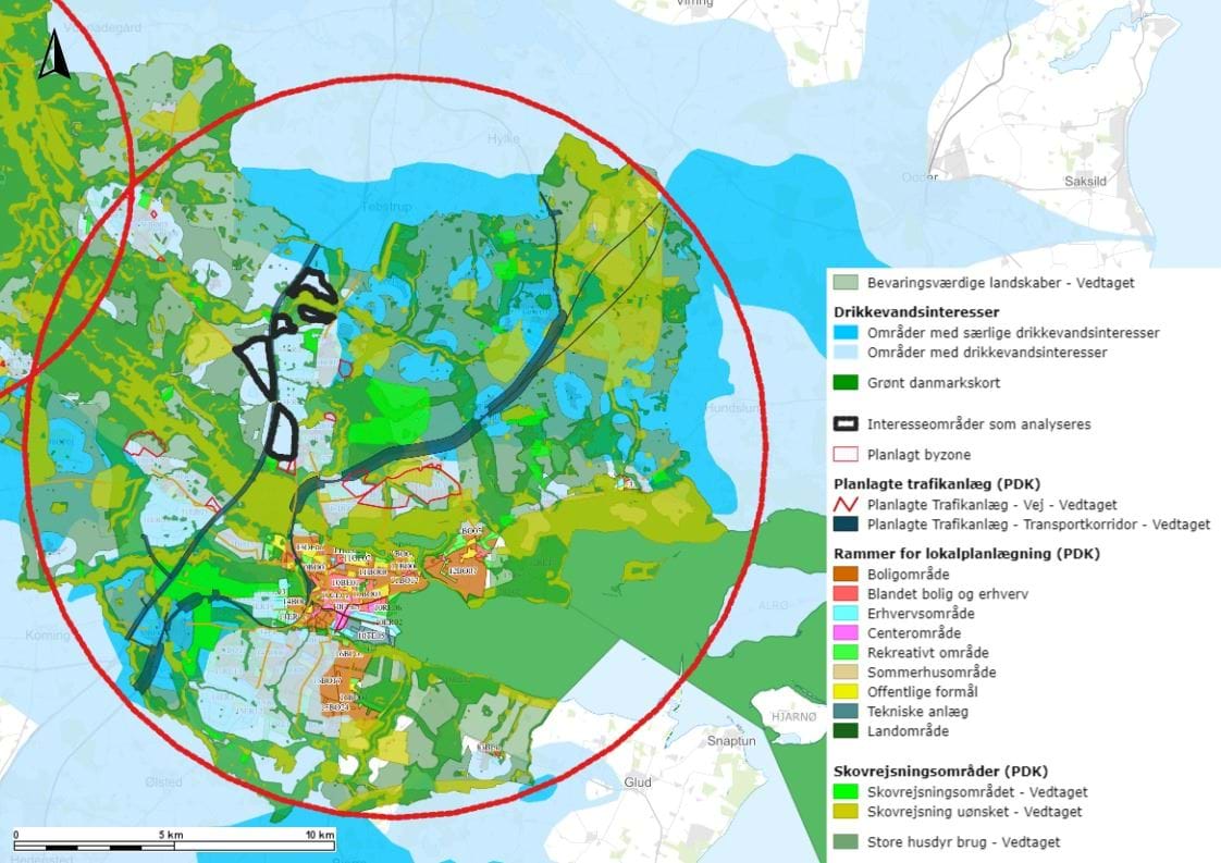 - Størrelse og kapacitet: Området skal være stort nok til at rumme den forventede mængde affald samt fremtidige udvidelsesmuligheder. Arealet er estimeret til 10 ha.