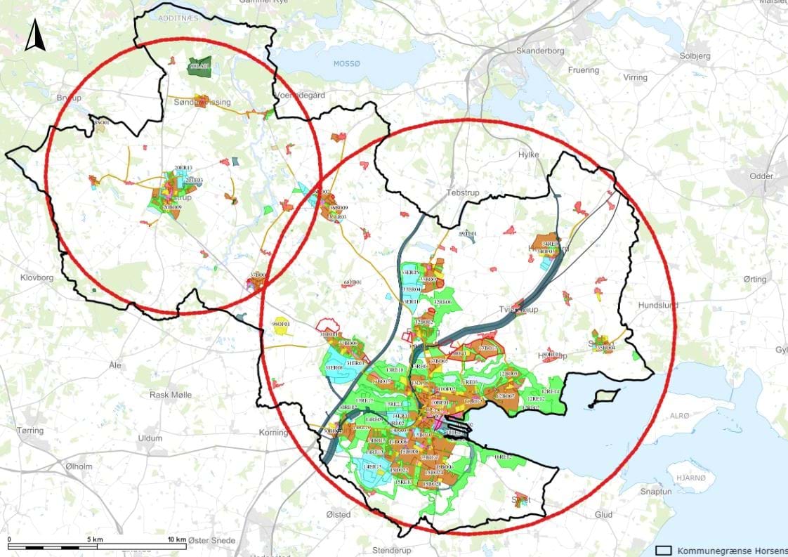 Horsens Kommune er konkret skåret igennem af E45 tæt på Horsens By. Denne gennemskæring begrænser anvendelsen af indefra-og-ud princippet. Der er derfor gennemført en undersøgelse af muligheder for at udlægge et konkret areal inden for rammen for byvækst, som indgår i Kommuneplan 2021-2033.