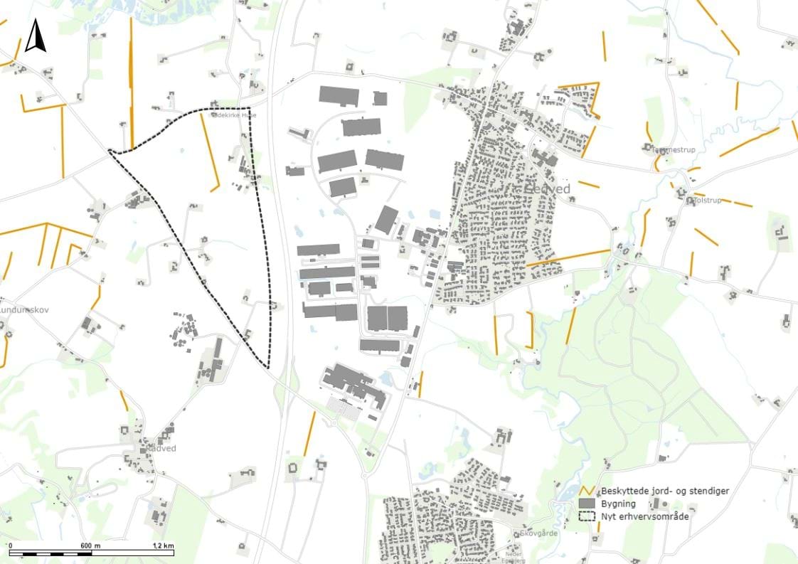 Et eksisterende dige er vurderet som væsentlig i både landskabelig og biologisk henseende og fastholdes som et aktiv for erhvervsområdet.