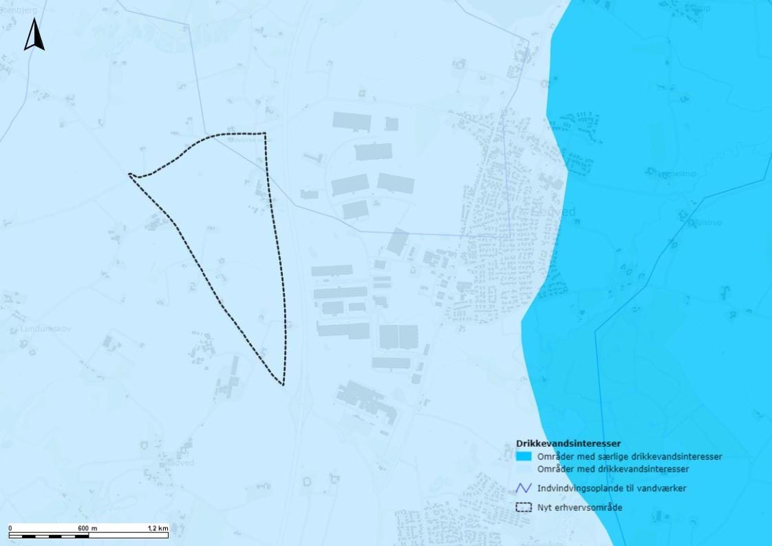 Det nordøstlige hjørne af erhvervsområdet ligger inden for indvindingsoplandet til Gedved Vandværk. Horsens Kommune har i november 2022 udarbejdet en grundvandsredegørelse, som konkluderer, at erhvervsområdet kan udlægges med en lav risiko for påvirkning af grundvandsressourcen i området. Der skal af hensyn til grundvandet derfor ikke stilles særlige krav til den fysiske indretning af området.
