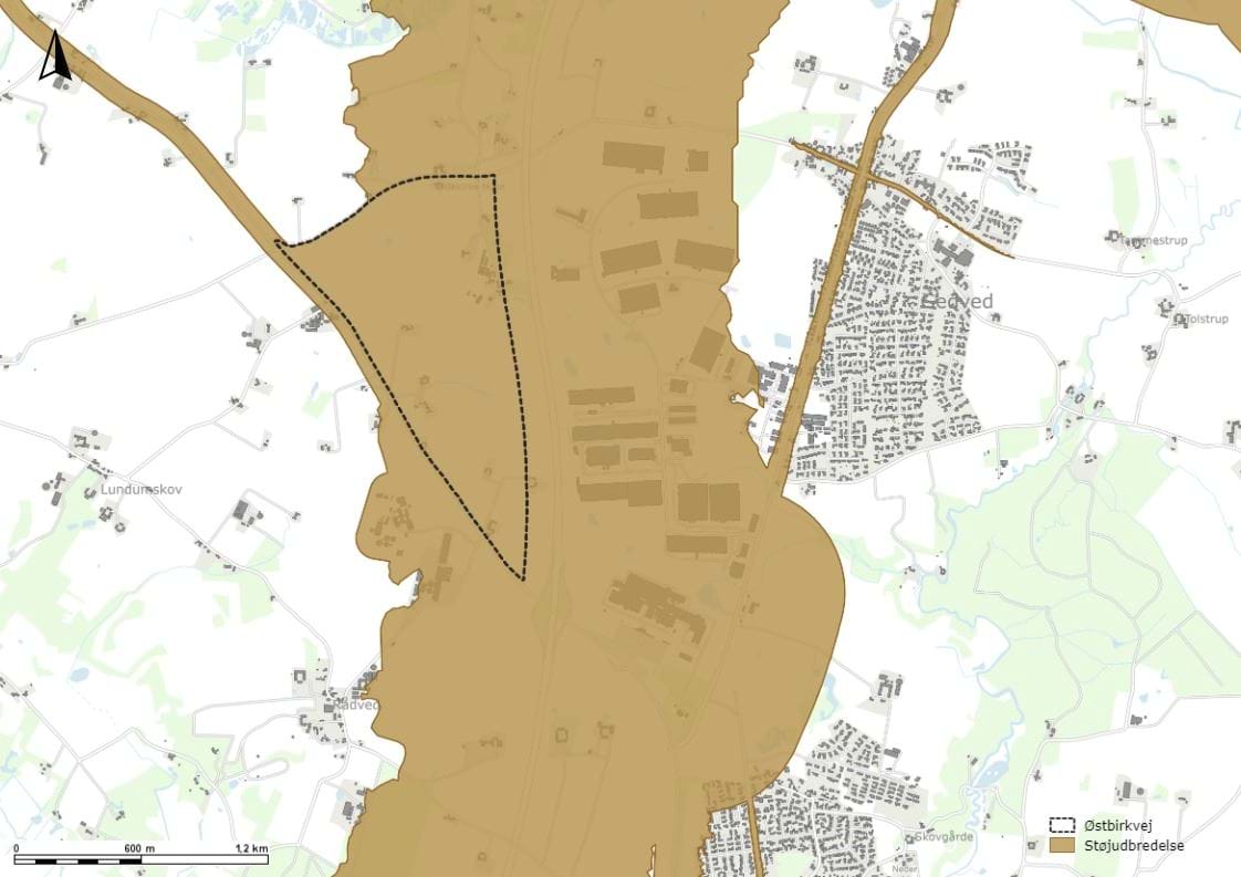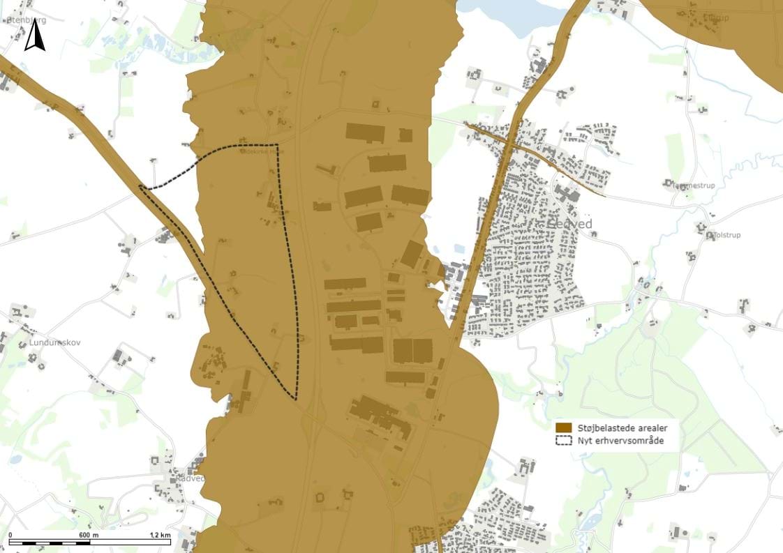 I forhold til støjbelastede arealer udvides støjudbredelsen til at omfatte det samlede område, som er omfattet af tillægget.
