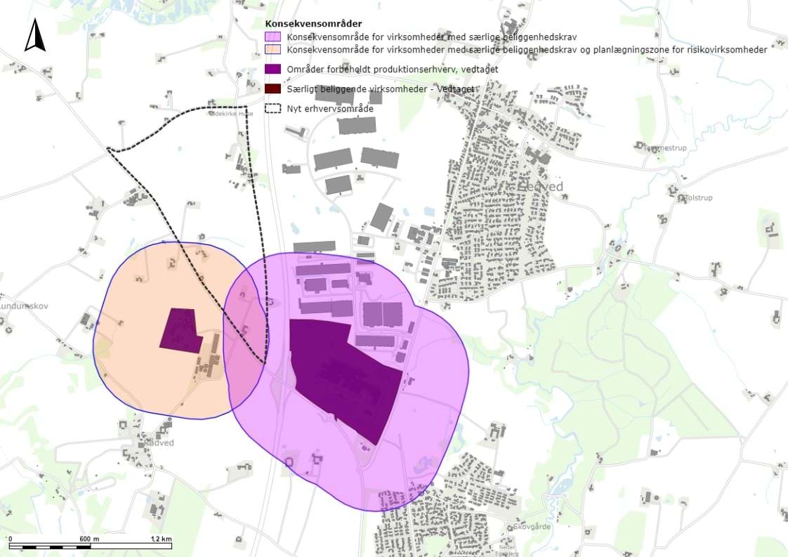 Målet er, at konflikter mellem naboer og virksomheder med særlige beliggenhedskrav og produktionserhverv undgås. Arealer til virksomheder med særlige beliggenhedskrav er udpeget i retningslinje 7.3, mens området til produktionserhverv er udpeget i retningslinje 7.4. Omkring udpegningen af områder med virksomheder med særlige beliggenhedskrav er udlagt et konsekvensområde på 500 meter. Konsekvensområdet skal sikre, at risikoen for større uheld inddrages i planlægningen. Både omkring Danish Crown øst for E45 og omkring Biogasanlægget syd for Østbirkvej er udpeget konsekvenszoner, som berører den sydlige og centrale del af det fremtidige erhvervsområde ved Østbirkvej.