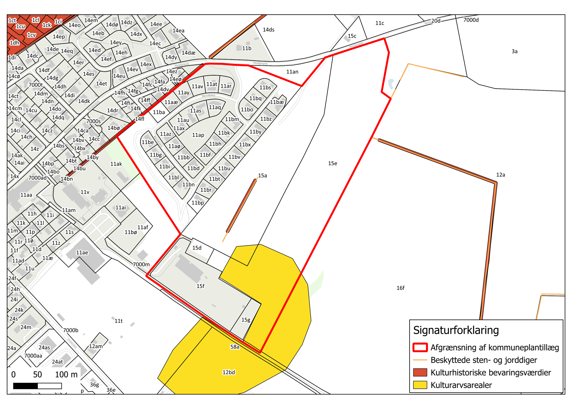 Resterne af det beskyttede jorddige beliggende inde i tillæggets område er udpeget som kulturhistorisk og skal bevares og beskyttes i planlægningen.