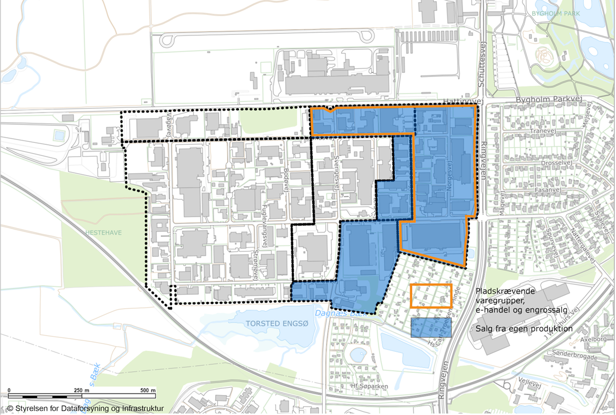 Rammeområdet må endvidere anvendes til butikker med særligt pladskrævende varegrupper. Rammeområdet må derudover anvendes til e-handel og engroshandel. Det samlede butiksareal til særligt pladskrævende varegrupper må være på 30.000 m2, og den enkelte butik må være på maks. 12.000 m2.
