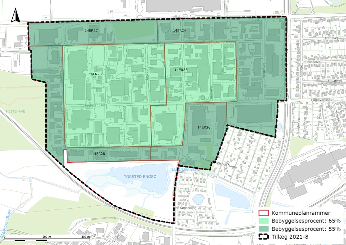 Justering af bebyggelsesproncenten til maks. 65 for rammerområderne 14ER23 og 14ER25 og en tilsvarende reduktion af bebyggelsesprocenten til maks. 55 for rammerområderne 14ER24, 14ER26 og 14ER28 sikrer, at restrummeligheden i erhvervsområdet ikke ændres.