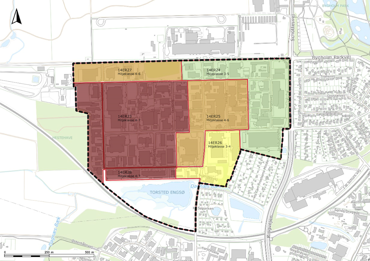 Illustrationen viser disponering af området efter principper omkring zonering med tungere miljøklasser i den vestlige del og mindre tunge miljøklasser i en buffer i randen af den østlige del af planområdet.
