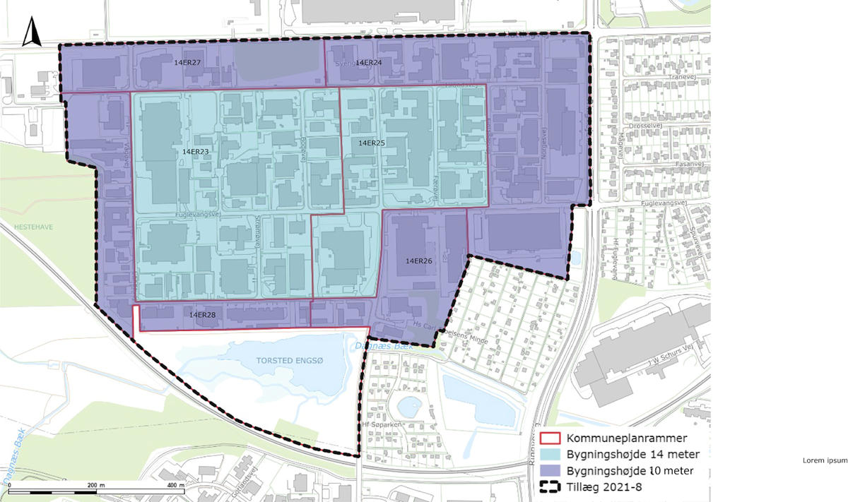 I den centrale del af planområdet, hvor matriklerne er større, hæves bebyggelsesprocenten til 65%. Her øges bygningshøjden tilsvarende til 14 meter. Oplevelsen af erhvervsområdet fra landskabet fra syd og fremtoningen mod de større indfaldsveje Hattingvej, Ringvejen og mødet med Sverigesvej øst for Torsted Engsø forudsætter, at planområdet fortsat fremstår uden større skalaspring til omgivelserne og fortsætter nuværende homogene samspil i mødet med de mindre strukturer i naboområderne. Derfor øges højden til maksimum 10 meter i områdets periferi, mens bebyggelsesprocenten reduceres til maksimum 55.