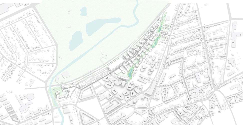 DSB Ejendomsudvikling A/S har lavet et udkast til en helhedsplan for den nye bydel, der består af to områder: Et område vest for Emil Møllers Gade og et mindre område syd for stationen.